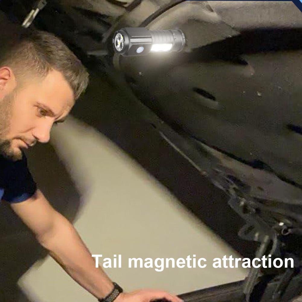 Features: 1. Grip-Enhanced Design: The super bright flashlight features a slip-resistant texture, increasing friction and ensuring a firm grip during use. This design minimizes the risk of dropping, enhancing safety, especially when used as a car maintenance light. 2. USB Rechargeable: Say goodbye to constant battery replacements with our mini portable torch's USB charging capability. Easily rechargeable via power sources or power banks, this flashlight is not only time-efficient and convenient but also eco-friendly, reducing battery waste. 3. Water-Resistant Durability: Equipped with everyday waterproof functionality, our car repair working light performs reliably in rain or humid conditions. Its resistance to water ingress makes it more durable and ideal for outdoor activities and emergency situations. 4. Compact Convenience: Small in size, this camping tent lamp is designed for portability. With an integrated clip, it can be effortlessly attached to pockets, backpacks, or clothing, ensuring it's always within reach for everyday use or outdoor adventures. 5. Versatile Lighting:This LED flashlight goes beyond standard illumination with added features for automotive maintenance, offering multiple light modes to cater to various situations and needs.