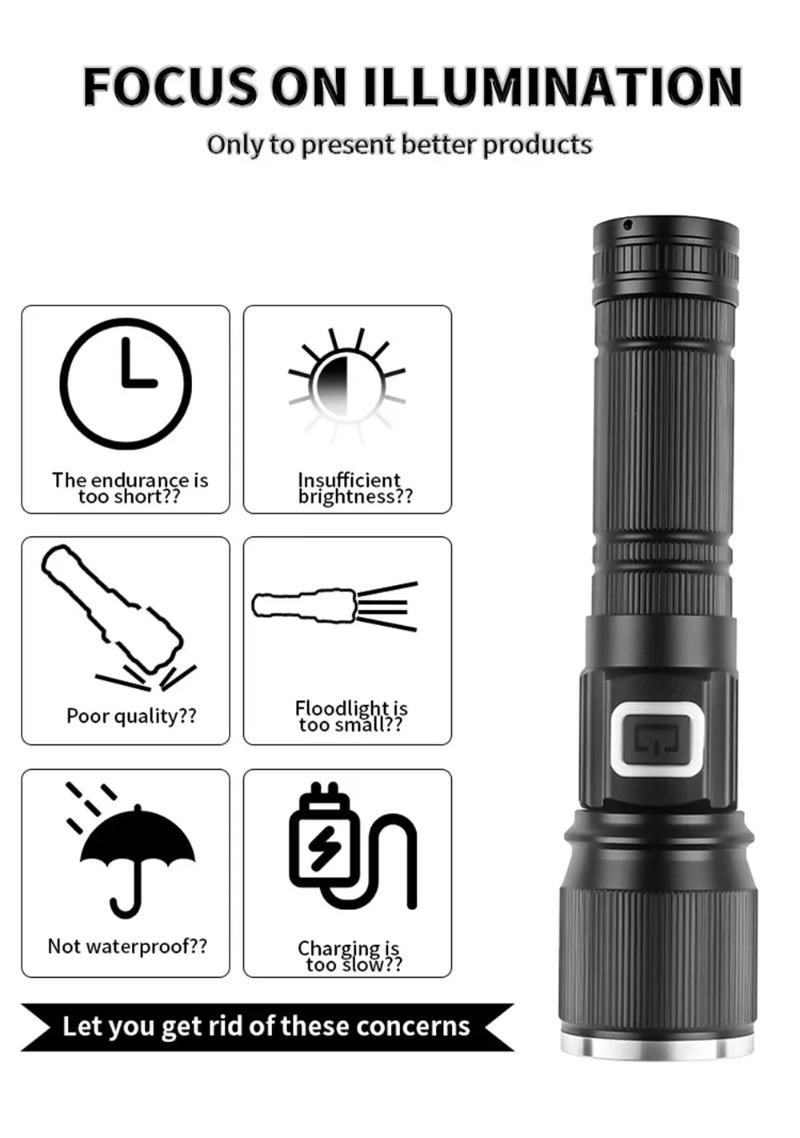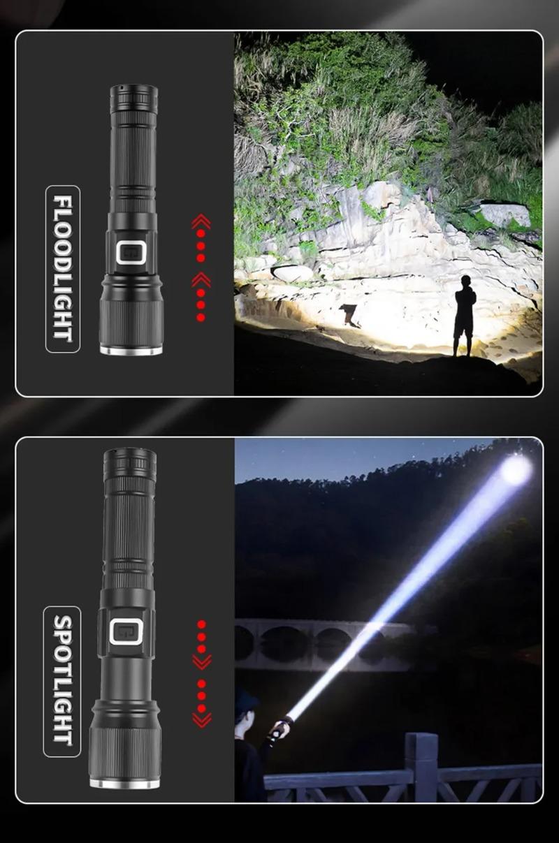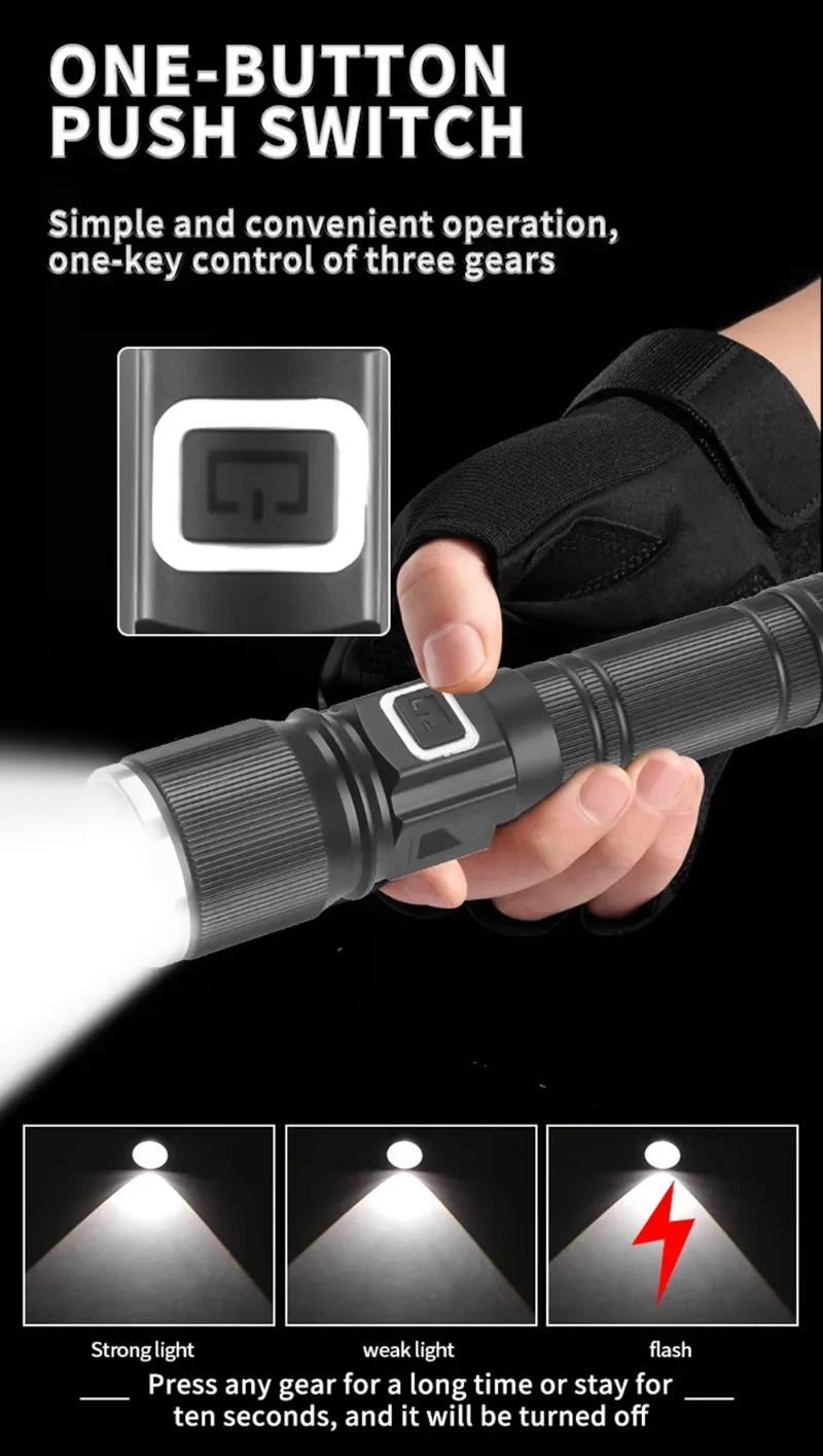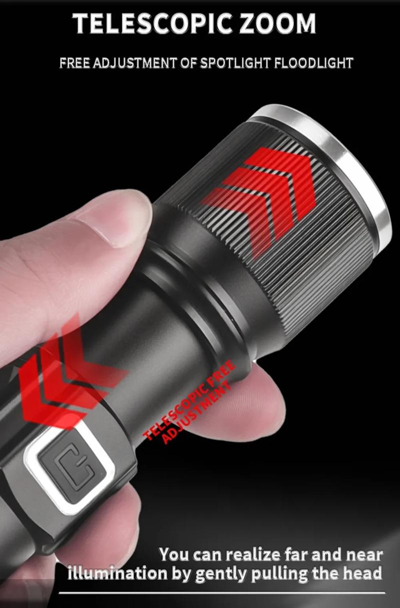 Super Bright LED Zoomable Flashlight 5 Lighting Modes Aluminum Alloy Torch with Power Display for Hiking Fishing Emergency