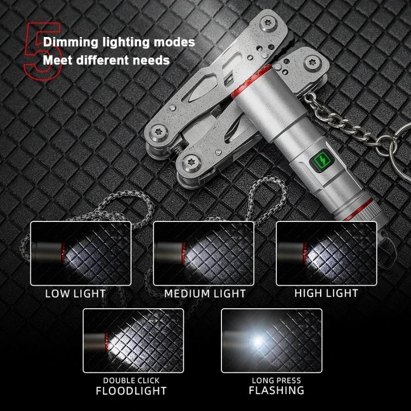 5. 5 lighting modes: (click) Low light - Medium light - High light; (Double click) Floodlight; (Long press) Flash.