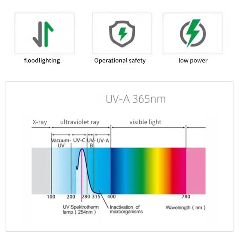 Wavelength: UV-A 365nm (non-harmful, safe for material inspection).